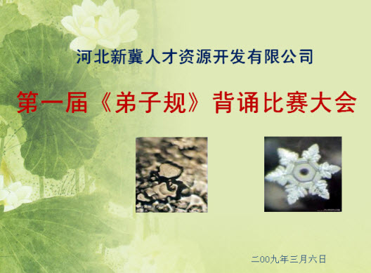 3月6日,河北新冀人才資源開(kāi)發(fā)有限公司舉辦了第一屆《弟子規(guī)》背誦比賽大會(huì),并取得了圓滿(mǎn)成功。本次比賽活動(dòng)由新冀公司發(fā)起,以學(xué)《弟子規(guī)》為主要內(nèi)容,行《弟子規(guī)》為目的,并最終實(shí)現(xiàn)將《弟子規(guī)》精神作為公司文化核心。